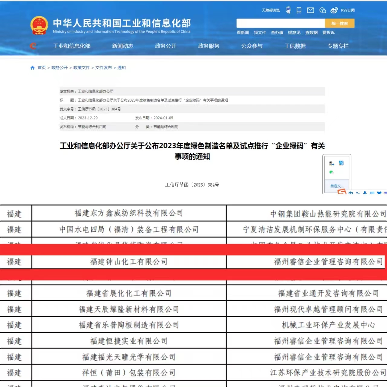 近日國家工業(yè)和信息化部辦公廳《工信廳節(jié)函〔2023〕384號文》公布2023年度綠色制造名單,福建鐘化順利入選2023年度國家級綠色工廠。